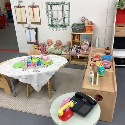 Home corner in nursery classroom with kitchen and appliances